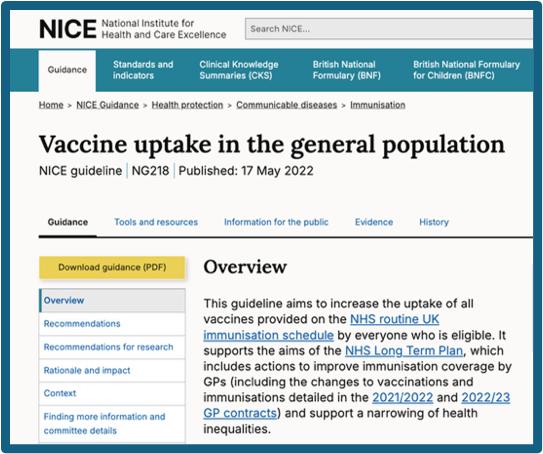 The NICE guidelines Vaccine Uptake in the general population published May 2022 aims to increase uptake of all vaccines provided on the NHS routine UK immunisation schedule. It includes actions to improve immunisation coverage by GP’s and support a narrowing of health inequalities.